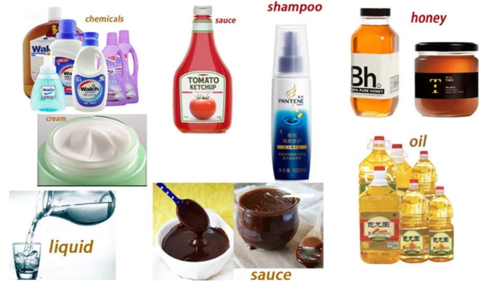 Poolviskoosne ja viskoosne vedelik; kassisupp, sinep, siirupid, salsa, majonees, mesi, maapähklivõi, želeed, kastmiskastmed, huulepalsam, šampoon, paksud seebid, vormigeelid, näomaskid, vaha, liim, määrded, hermeetikud, silikoon ja palju muud