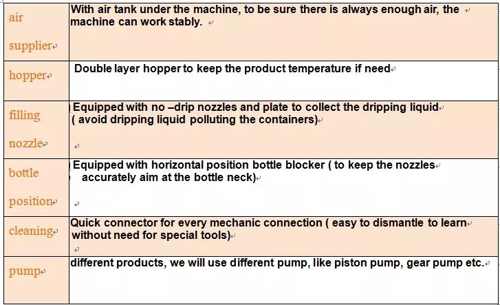 See masin on spetsiaalselt valmistatud igasuguste viskoossuse / vedelike jaoks toiduainetööstuses, keemiatööstuses ja toiduainetes, näiteks mootoriõli, mootoriõli, salat, kätepesugeel, kookosõli, sojakaste, seesam, šampoon, vedelseep, mootoriõli , piduriõli, toiduõli, tomatikaste, jook, essentsõli, taimeõli, mesi, piprakaste, maapähklivõi, jogurt, mahl, jook jne. Kogu vedelikuga / kastmega kokku puutunud osa on kvaliteetne roostevaba teras.masin võtab vastu kolbpumba täitmiseks.Positsioonipumba reguleerimisega saab see täita kõik pudelid ühes täitemasinas, kiire ja suure täpsusega.