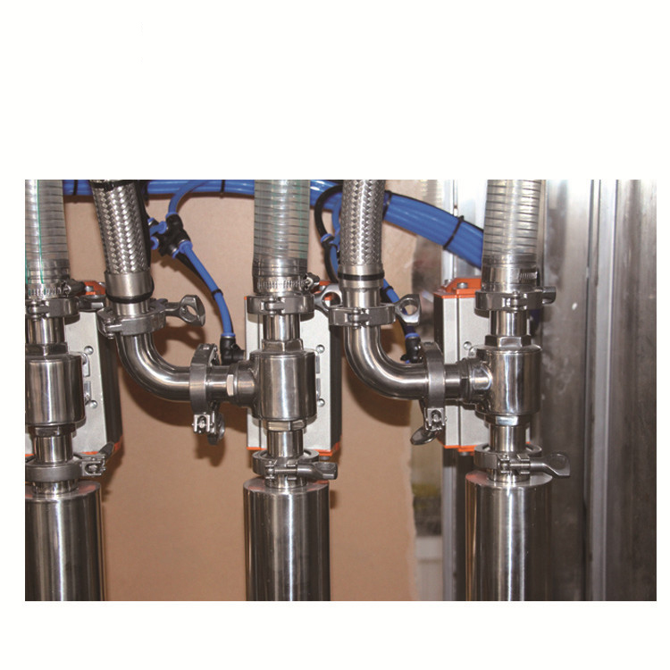3. Suurema väljundvajaduse saab rahuldada kaherealise pudeli etteande, kahe rööpa täitmise ja kahe otsiku korgi kruvimise või valtsimise ja pressimisega. Sellel masinal on suur täitmise täpsus ning seda saab laiali lahti võtta ja mugavalt steriliseerida, kasutades kiireühendusega roostevabast terasest kolbpumpa. Pideva pöördemomendi korgi kruvimise ja pneumaatilise kaitsme kasutamisel on suletud suu lekkekindel.